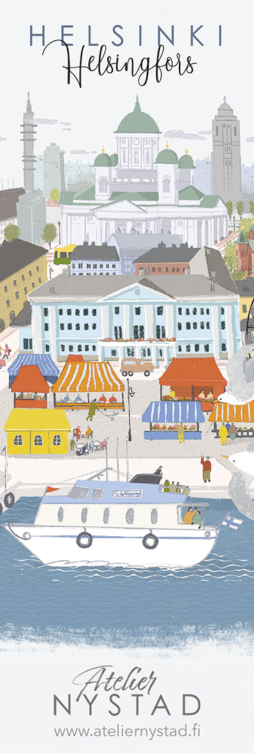 Helsinki – Helsingfors juliste  jatkaa värikkäiden rannikon kaupunkien sarjaa. Julisteet syntyvät arkisista asioista, ja kertovat visuaalisella tarinallaan enemmän paikan tunnelmasta kuin tunnettavuudesta kaupungissa.